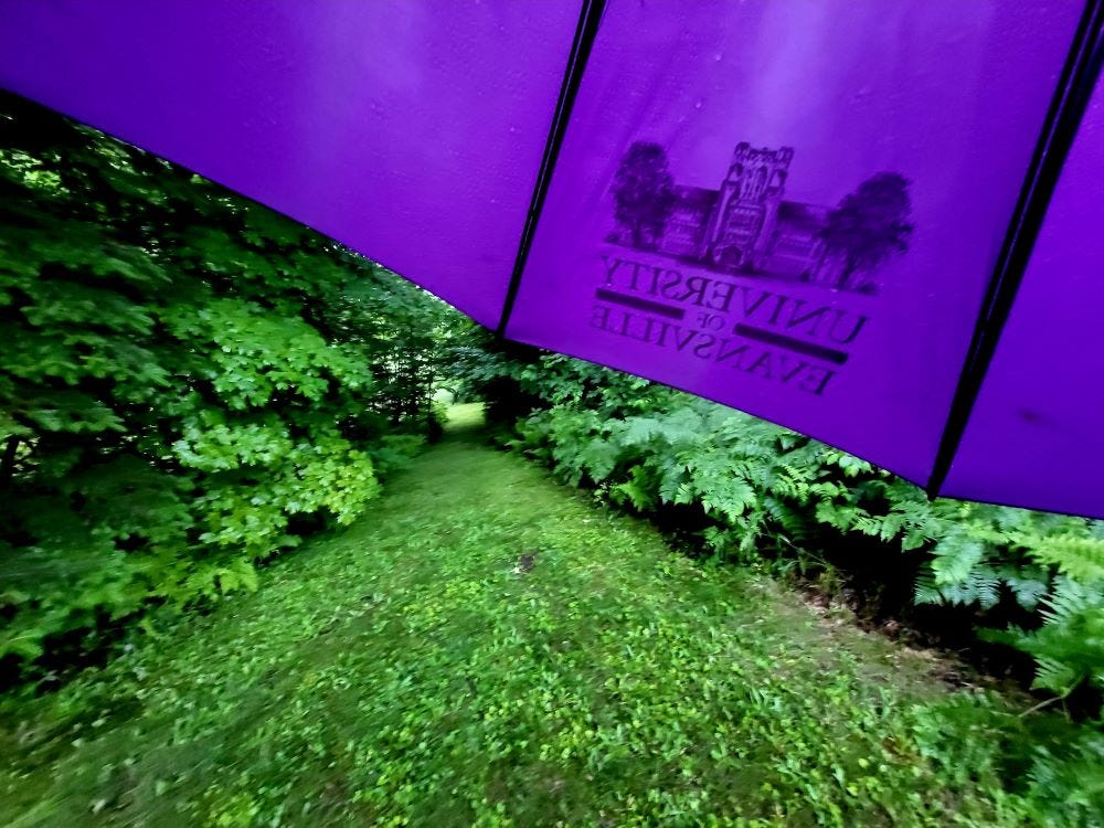 Hour 13 (1800) – As an undergrad, I bought an umbrella to walk between classes on campus. It is oversized and professional in its sturdiness. For thirty years it seems to rest in the closet (often near the dog food) but I open it today for this lap. I’m not sure how dry umbrellas keep people, but it does bring me an unusual voiceless joy.